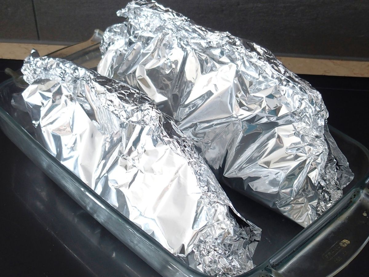 3) Sur une planche en bois par exemple, poser une grande feuille de papier d'aluminium, assez grande pour contenir un filet et pouvoir ensuite la fermer sur elle-même facilement (face brillante contre le fond, donc non visible, car on pose le poisson sur la face la moins brillante pour éviter l'oxydation).