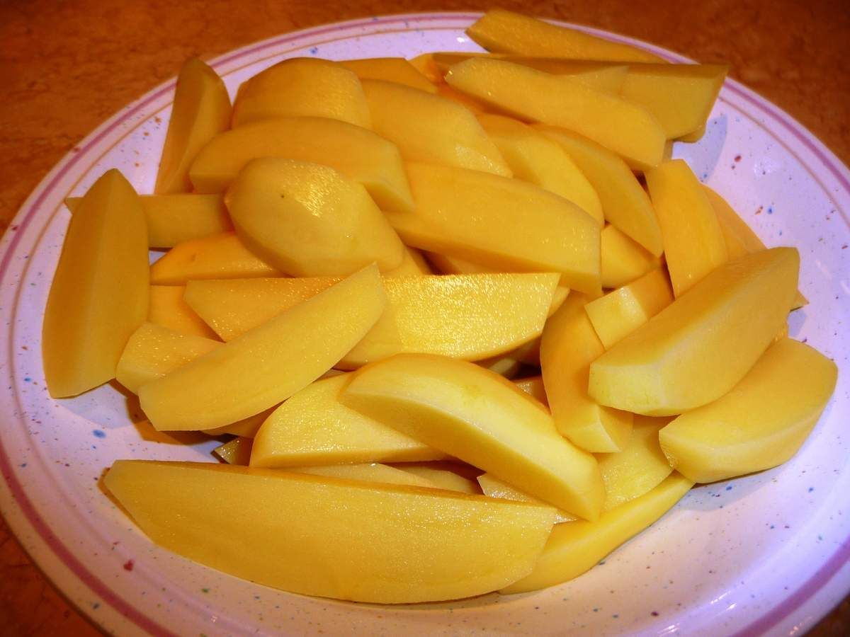 2) Eplucher les pommes de terre, les rincer à l'eau froide. Les couper en deux dans la longueur, puis en 2 ou en 3 suivant la grosseur, toujours dans la longueur, afin d'obtenir de grosses frites. Hacher finement le persil et le mettre dans un bol. Réserver.