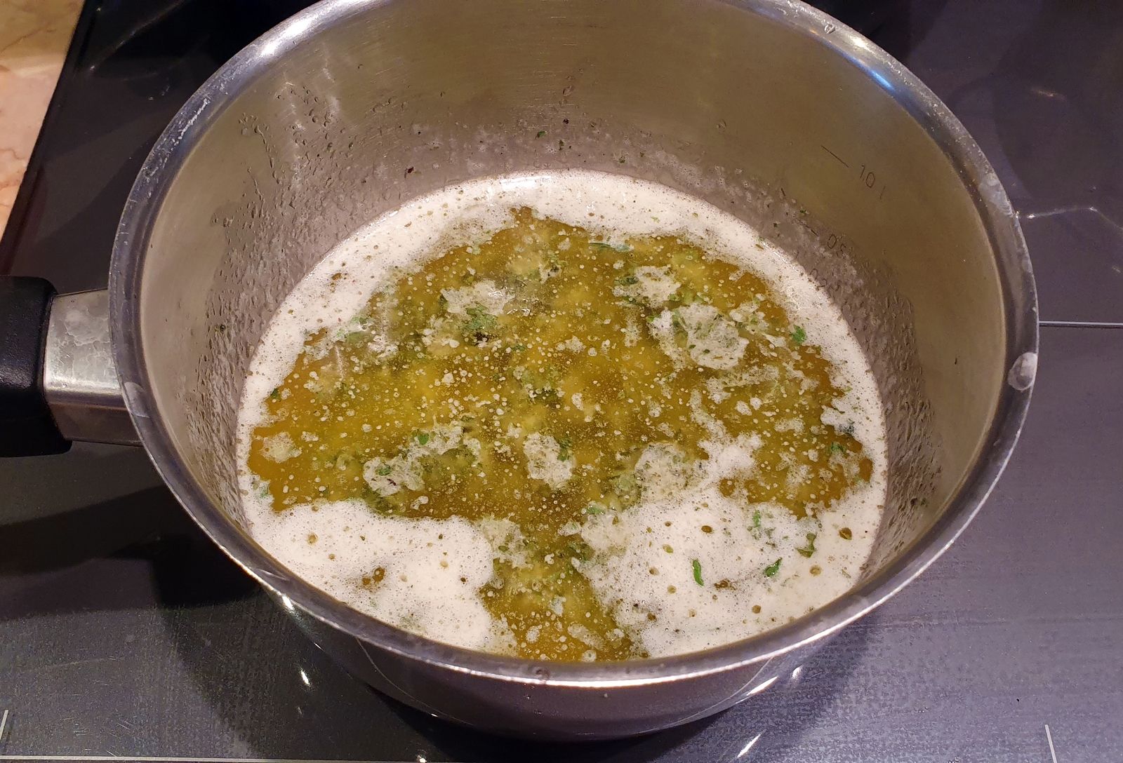 4) Préchauffer le four à 70°C. Dans une casserole, mettre les 200g de beurre et le faire fondre à feu très doux. Ajouter le jus de citron et le persil haché finement. Dans un plat allant au four, mettre un peu de beurre persillé dans le fond. Mettre le plat au four.