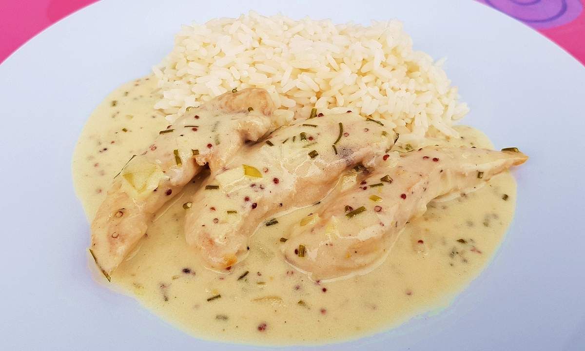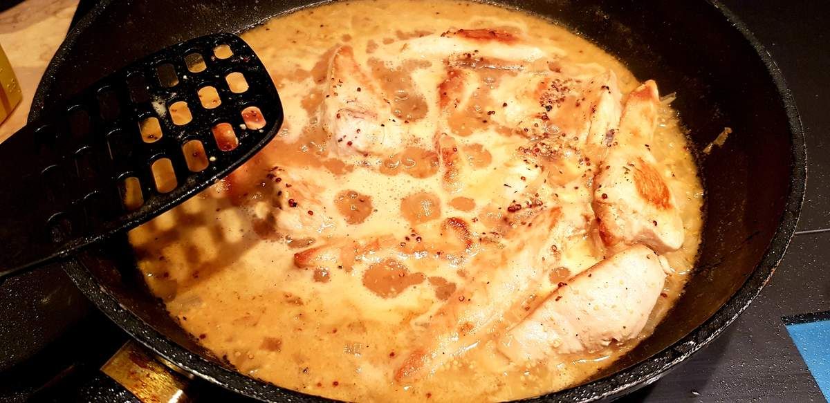 Moi je vous suggère aujourd'hui de découper vos escalopes en filets et des les apprêter avec une super sauce à la moutarde. Moi j'aime bien le goût subtil de la moutarde. Si vous l'aimez plus prononcé, ajouter une bonne cuillère à soupe à la recette. L'important est d'avoir une moutarde en grains et l'autre lisse, forte.