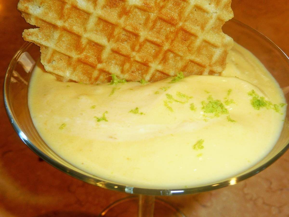 4) Verser immédiatement dans des coupelles, râper un peu de zeste de citron vert, et servir avec un biscuit léger et croquant
