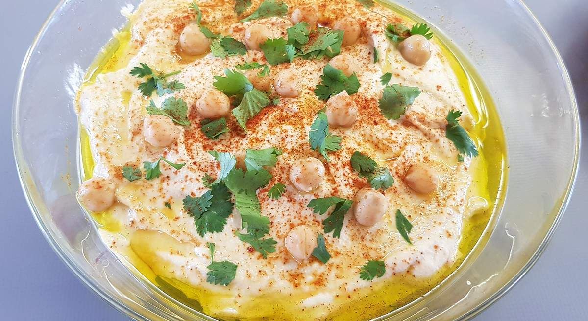 4) Mettre l'hommos dans un plat creux. Réfrigérer jusqu’au service. Arroser d'un bon filet d'huile d'olive. Décorer avec les pois chiches entiers. Parsemer le centre de coriandre. Saupoudrer avec du paprika pour donner de la couleur. Servir avec du pain libanais.