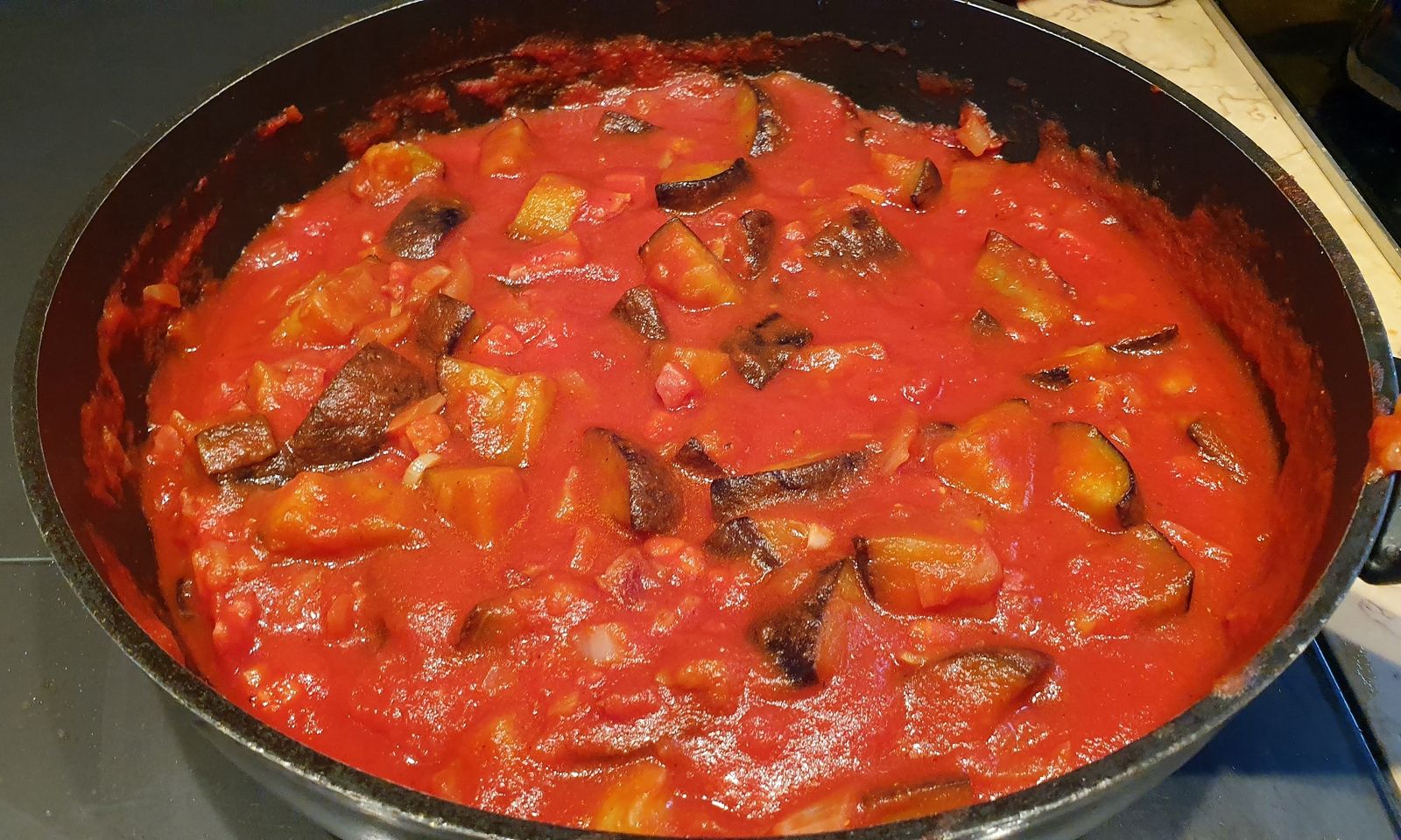 7) Ajouter les dés d'aubergines dans la sauce et laisser mijoter encore une dizaine de minutes. Goûter et rectifier l'assaisonnement.