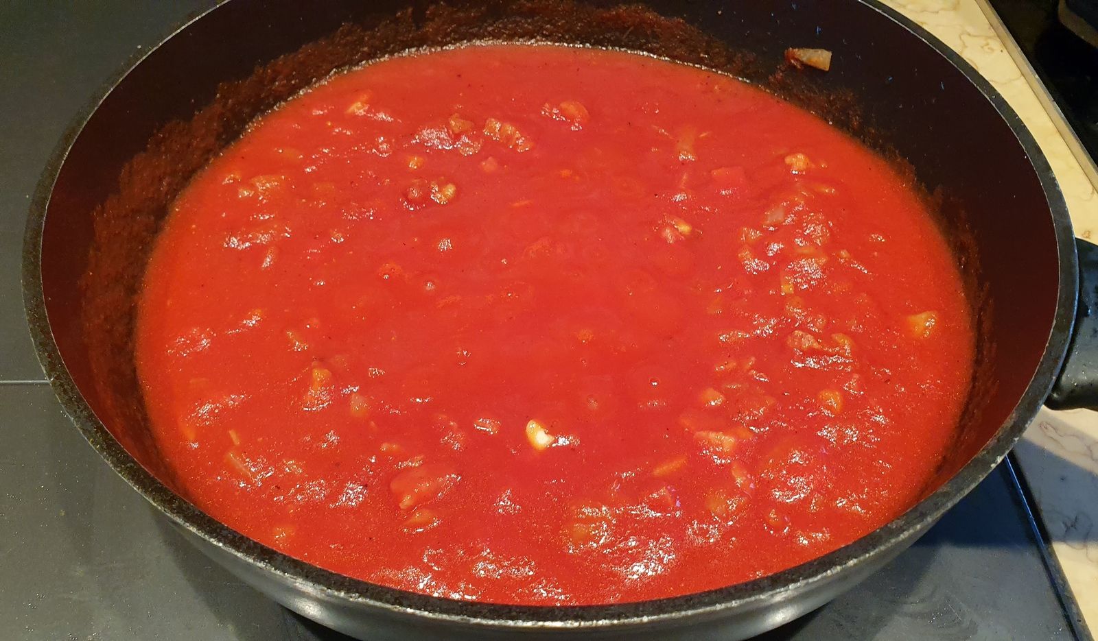 4) Ajouter les tomates et le piment ou paprika, poivrer un peu et laisser mijoter à découvert sur feu doux 15 minutes.