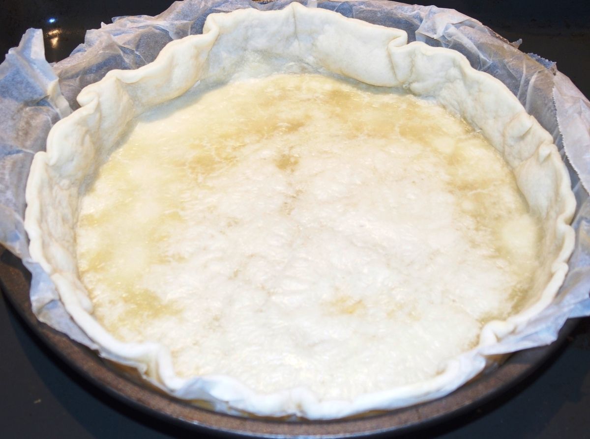2) Foncer le moule à tarte avec la pâte abaissée. Moi, je laisse le papier sulfurisé. Sinon, beurrer et fariner le moule à tarte avant d'y déposer la pâte. Bien appuyer sur la pâte sur tout le tour du moule afin qu'elle adhère bien. La coller presque contre les bords (sinon elle va se rétracter et retomber dans le moule). Ainsi que sur le contour du fond qui fait angle droit avec les bords. Piquer avec une fourchette le fond. Dans un grand récipient, casser les oeufs. Tremper un pinceau à pâtisserie uniquement dans le blanc et badigeonner le fond de la tarte au pinceau avec le blanc (l'équivalent d'une cuillère à soupe).  Enfourner dans le bas du four préchauffé à 220°C sur la grille pour 7 à 8 minutes. Si la pâte lève en cours de cuisson, ouvrez la porte du four et piquez avec une fourchette. Non mais, on va pas se laisser faire... Sortir le moule du four et baisser la température à 200°C.