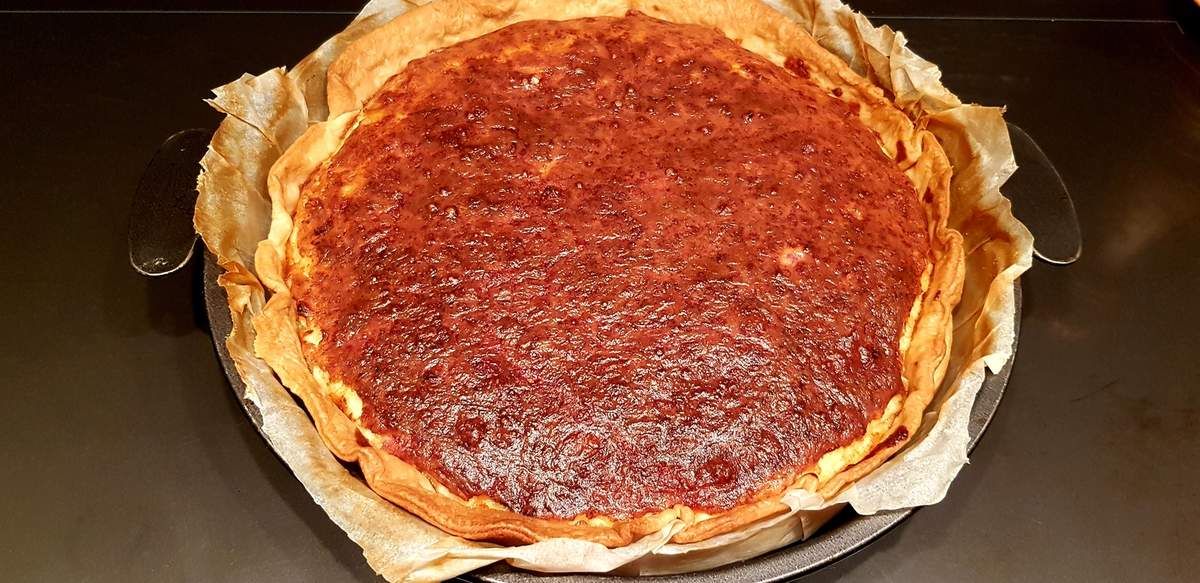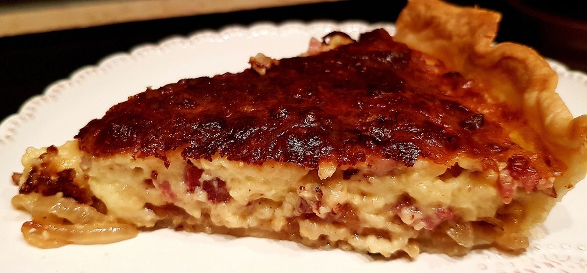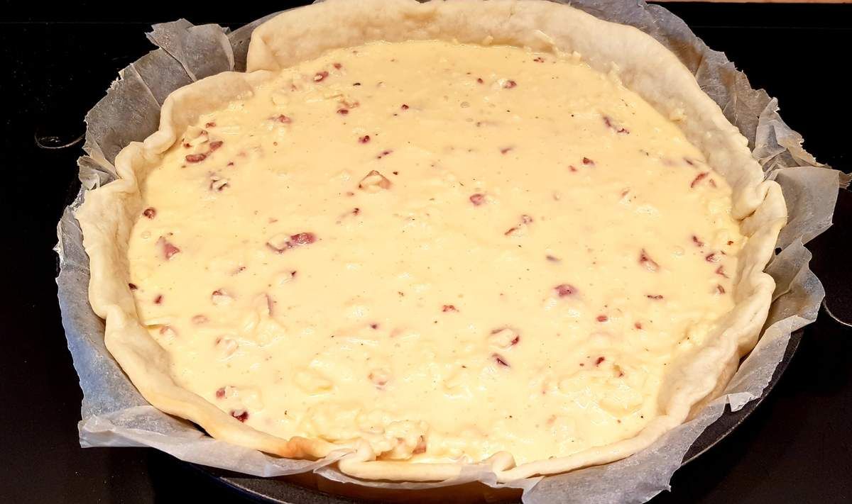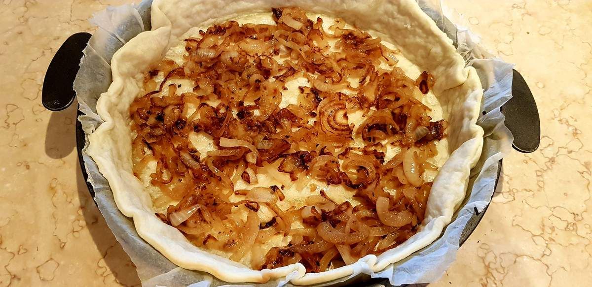 4) Dans le moule, mettre les oignons sur le fond de la pâte. Verser délicatement la liaison au fromage et lardons et enfourner immédiatement dans le bas du four pour 30 minutes! Sortir, laisser reposer 2 minutes et déguster.
