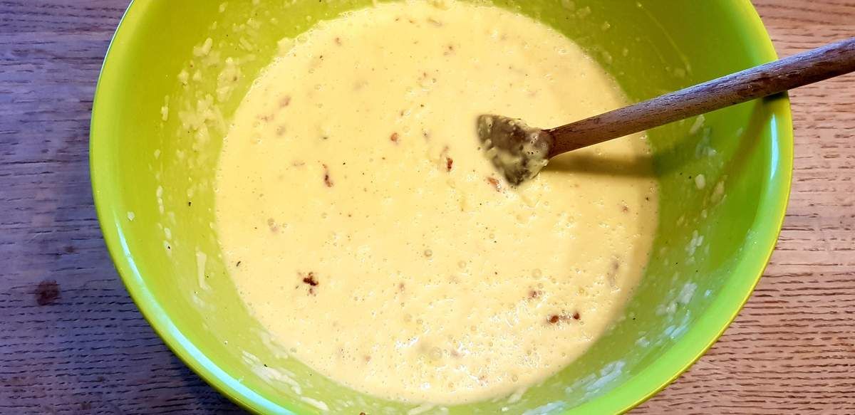 3) Râper le gruyère. Dans le récipient contenant les oeufs, ajouter la crème, et le lait. Poivrer. Bien mélanger au fouet. Ajouter le gruyère, les lardons et la farine et bien mélanger avec une spatule. Ne pas saler, les lardons et le fromage salent déjà l'ensemble.