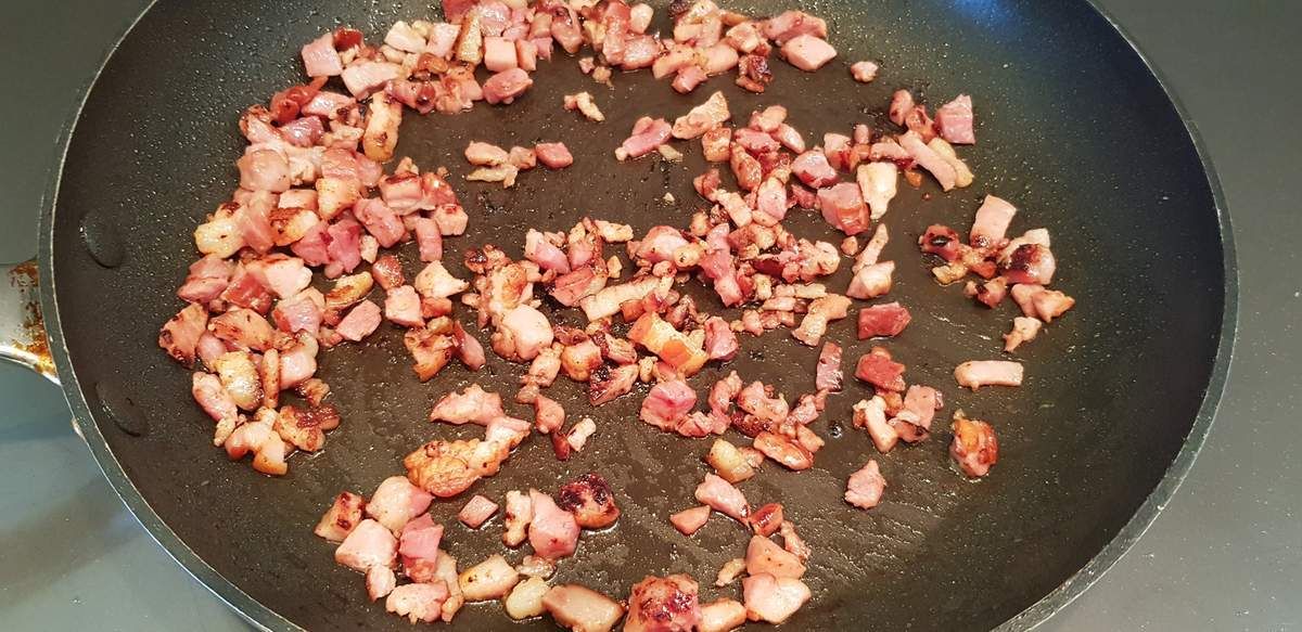 1) Préchauffer le four à 220°C. Eplucher les oignons, les couper en deux et les émincer en rondelles. Dans une poêle chaude, faire revenir les lardons 2 minutes sur feu moyen-vif. Les retirer et les mettre de côté dans une assiette sur du papier ménage. Dans la même poêle, faire chauffer un peu d'huile à rôtir et ajouter les oignons. Bien mélanger et baisser le feu sur feu moyen-doux. Saler très légèrement, poivrer. Laisser ainsi les oignons cuire durant 20 à 30 minutes en remuant souvent, jusqu'à ce qu'ils soient fondants. Réserver et laisser tiédir.
