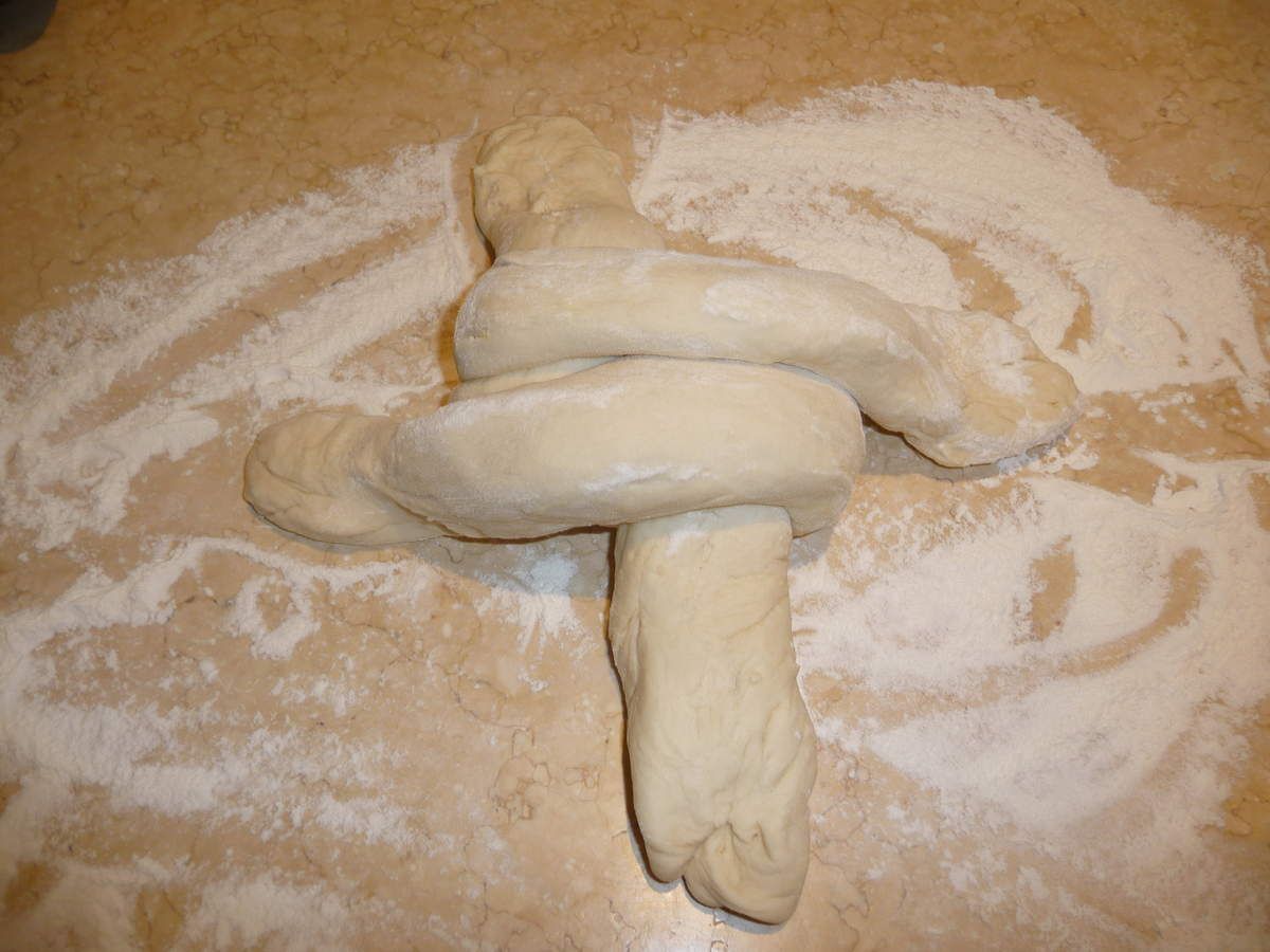 - Réunir les petites extrémités des boudins en travaillant un peu la pâte. Renverser la tresse contre le bas et l'entourer de toutes parts avec vos deux mains en la tapotant amoureusement pour lui donner une forme régulière: