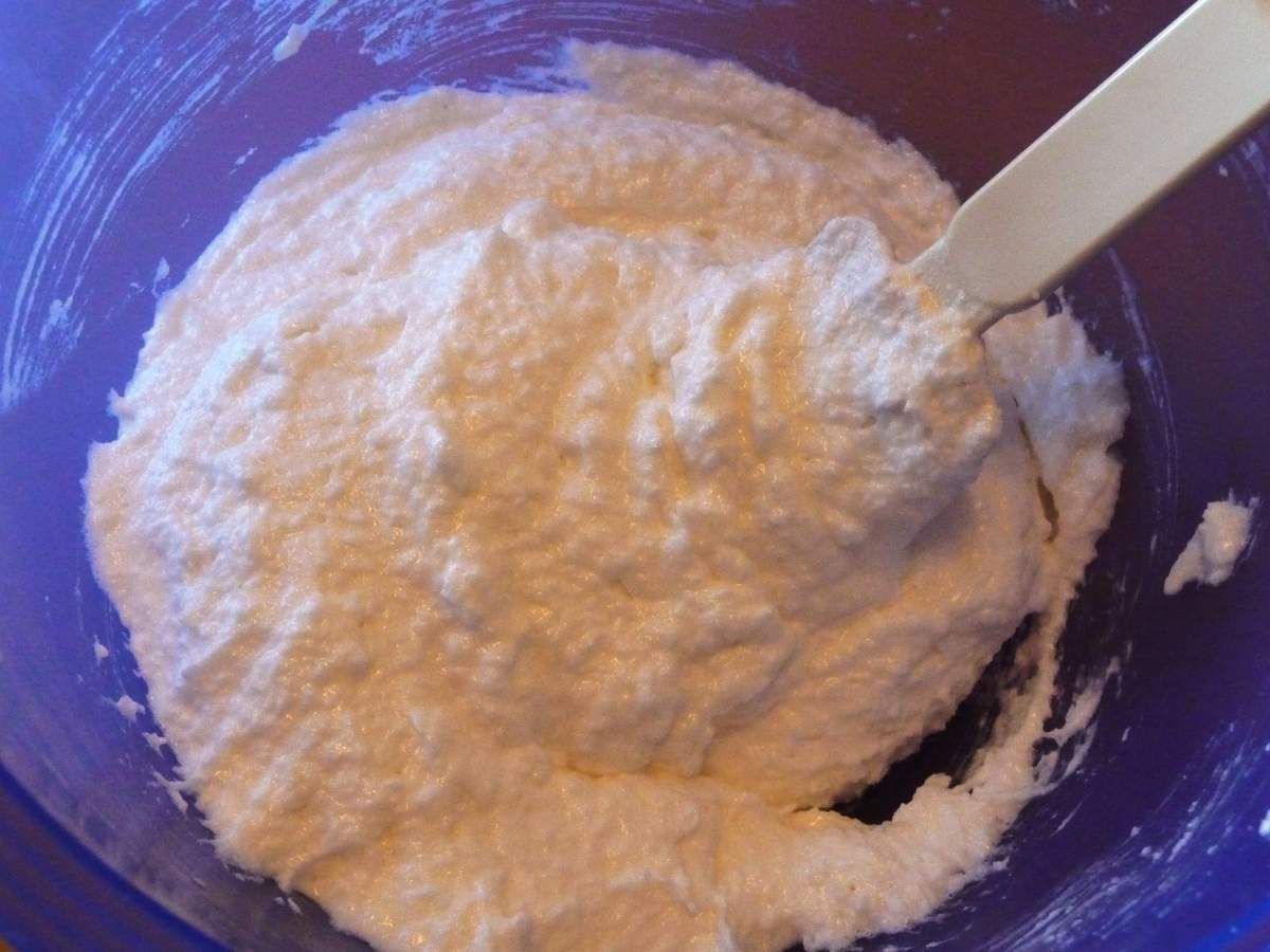 3) Incorporer le sucre petit à petit en fouettant jusqu'à ce que le mélange soit lisse et brillant. Incorporer la noix de coco avec une spatule.