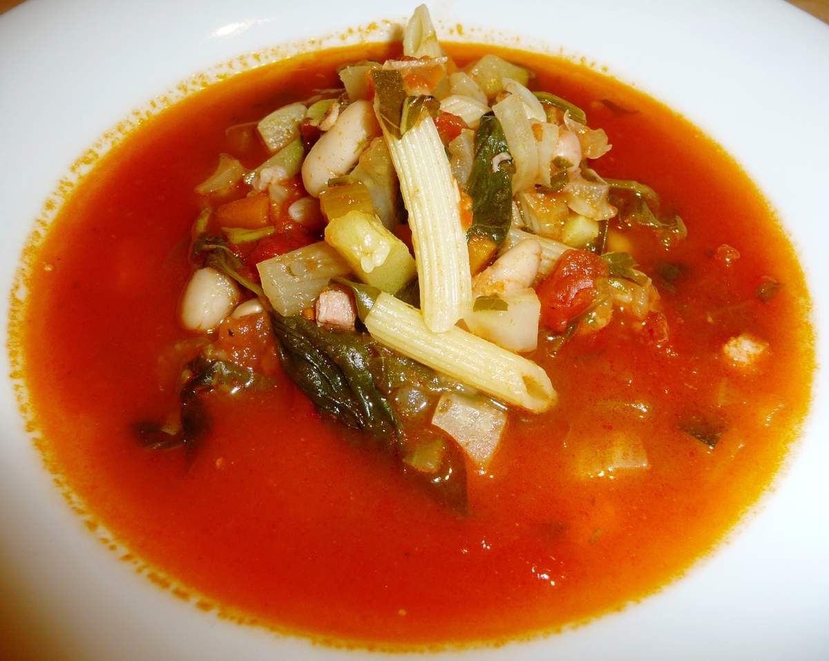Une soupe délicieuse qui tombe à point pour la saison! Haricots blancs, tomates, épinards frais, céleri, fenouil, carottes, pancetta, basilic, courgettes, petites pâtes..., des ingrédients à adapter selon vos goûts. Moi j'aime tous les légumes, donc j'ai fait une minestrone "à la totale".