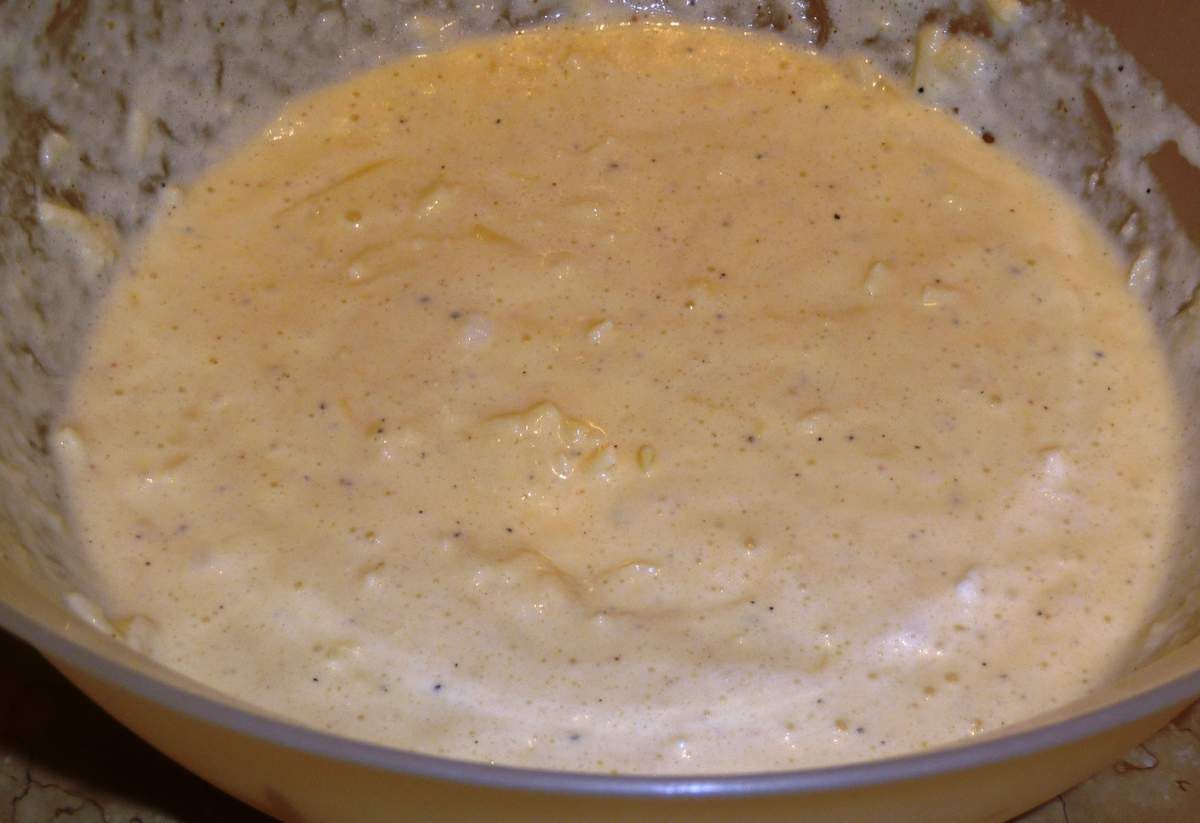 3) Dans un autre grand récipient, mettre la crème, le lait, les jaunes d'oeufs (mettre 2 blancs dans un autre récipient, jeter le 3ème), le poivre, un petit peu de sel (pas trop, 1/2 càc), un peu de muscade et la farine. Bien mélanger. Ajouter les fromages et mélanger. Si vous souhaitez une consistance plus traditionnelle, ajouter simplement les 3 oeufs entiers.
