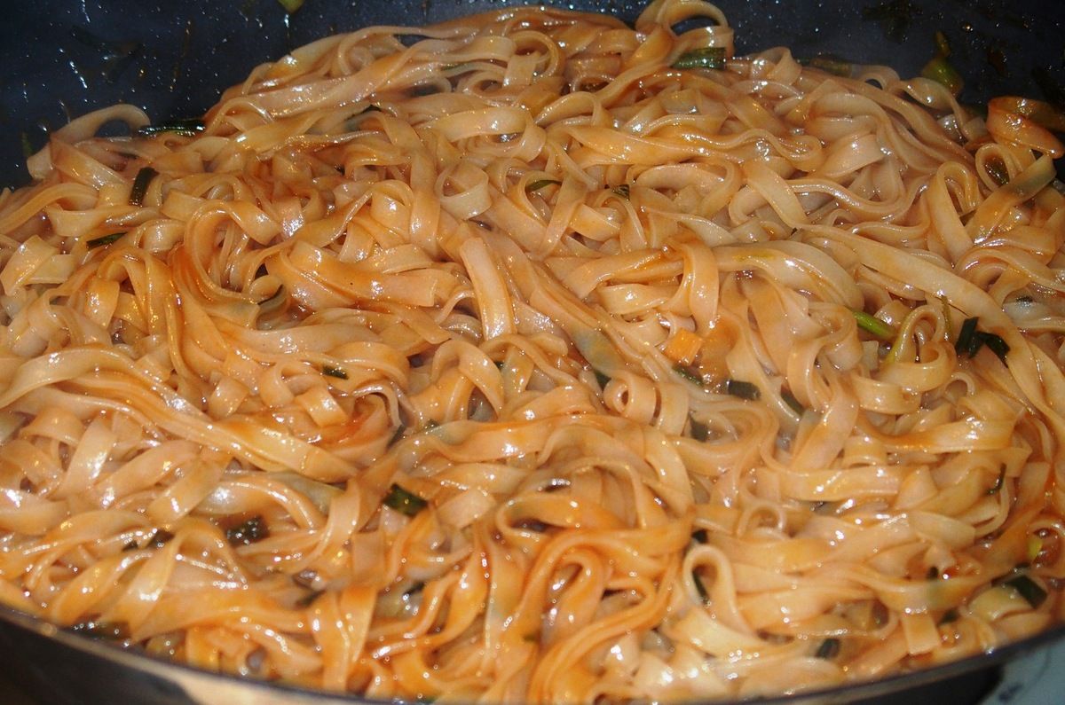 10) Rincer et égoutter les nouilles. Dans la même poêle, remettre à chauffer un peu d'huile et faire revenir les oignons et les feuilles d'ail 2 minutes. Puis ajouter la sauce pad thaï. Laisser caraméliser 2 à 3 minutes en mélangeant.