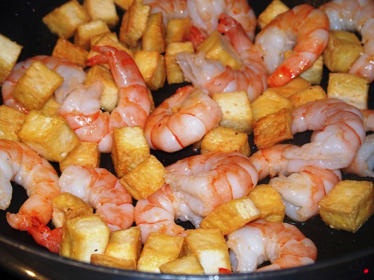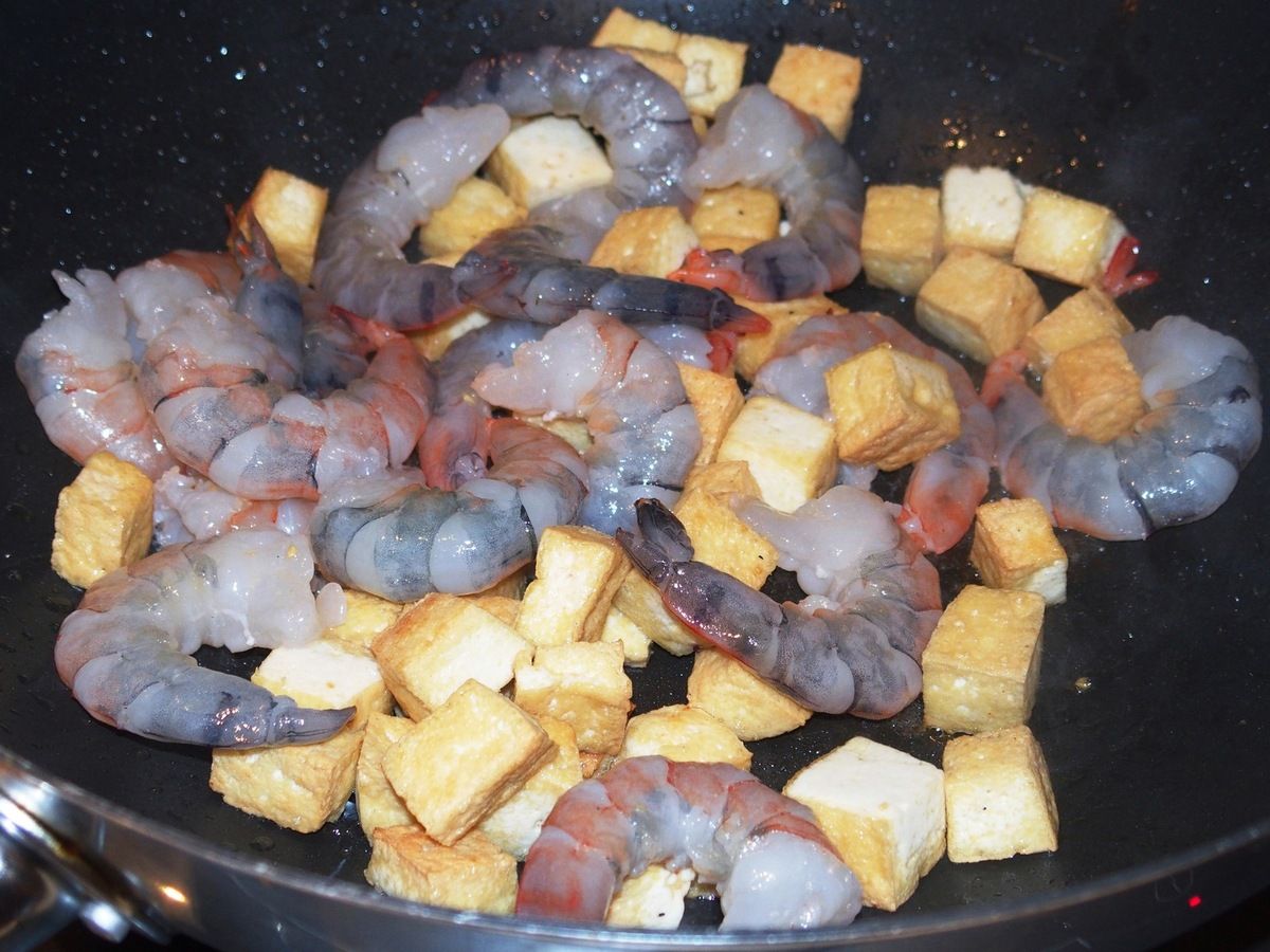 11) Ajouter les nouilles ainsi qu'un peu d'eau (2dl). Brasser sans cesse et faire revenir 5 minutes sur feu moyen en ajoutant de l'eau petit à petit jusqu'à ce qu'elles soient al dente. Ajouter les crevettes et le tofu. Bien mélanger.