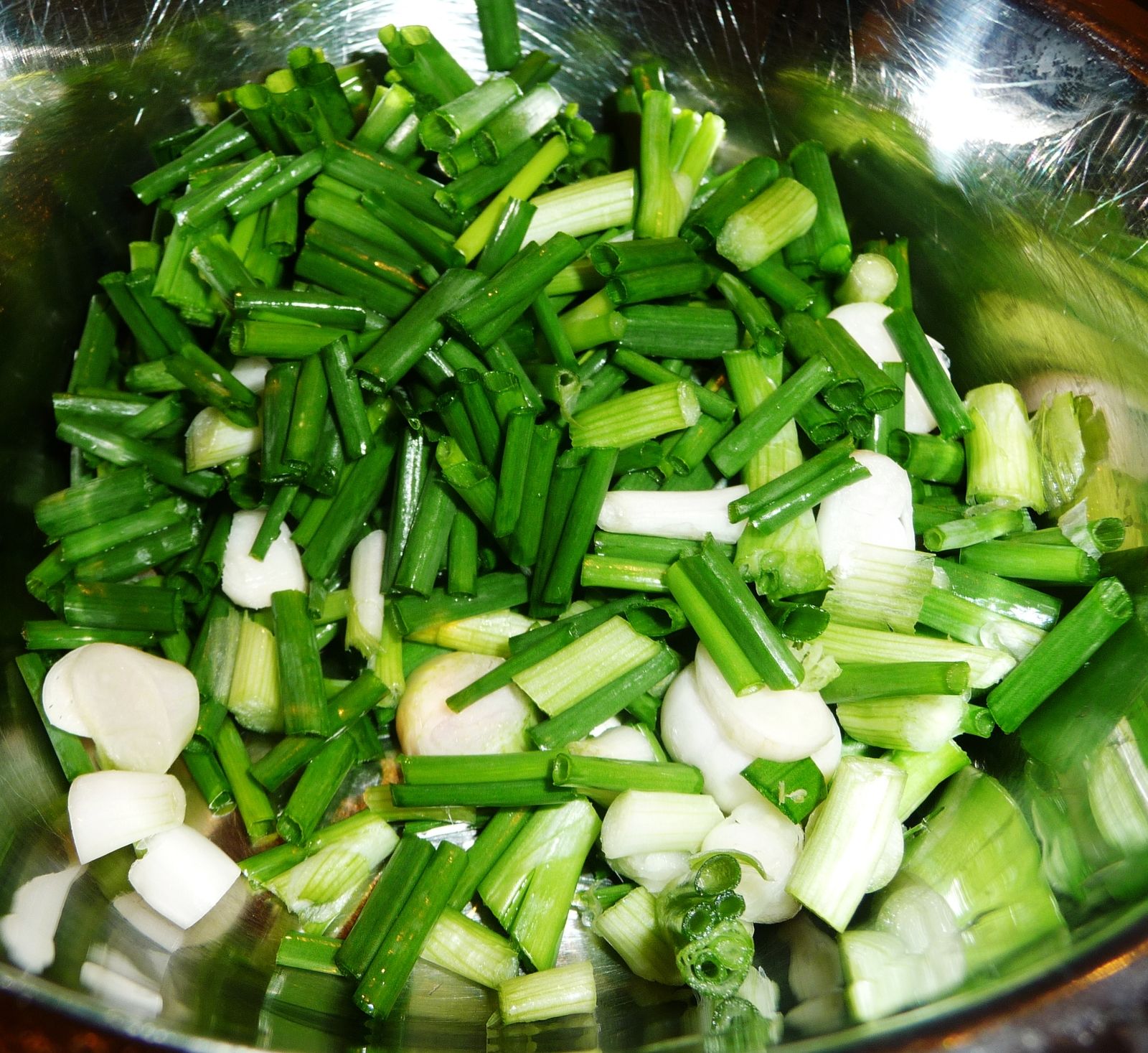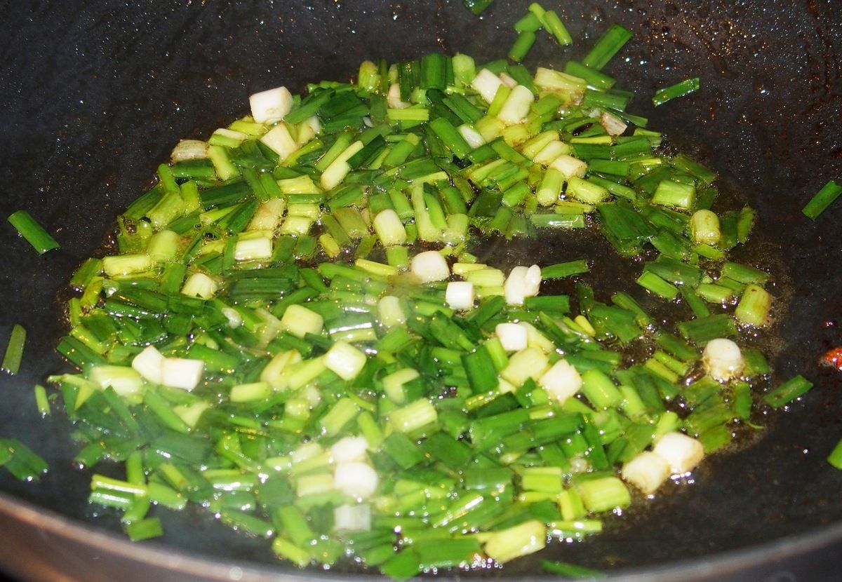 3) Couper un peu les extrémités des feuilles d'ail et des oignons de printemps et ciseler. Réserver dans un bol.