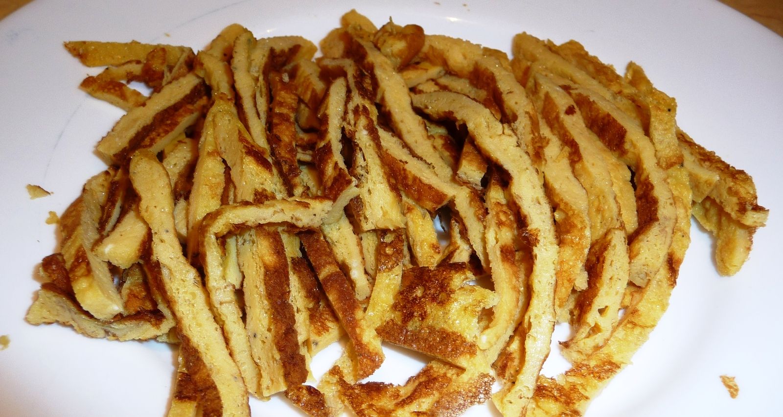 2) Fouetter les 2 oeufs dans un bol avec une 1 càc de sauce soja. Faire une omelette: faire chauffer de l'huile dans une poêle et verser les oeufs. A feu moyen, laisser prendre 3 minutes en remuant un peu avec une spatule puis laisser cuire 2 minutes. Retourner l'omelette et laisser cuire encore 1 minute. Laisser refroidir sur une assiette. Couper en lanières et réserver dans un bol.