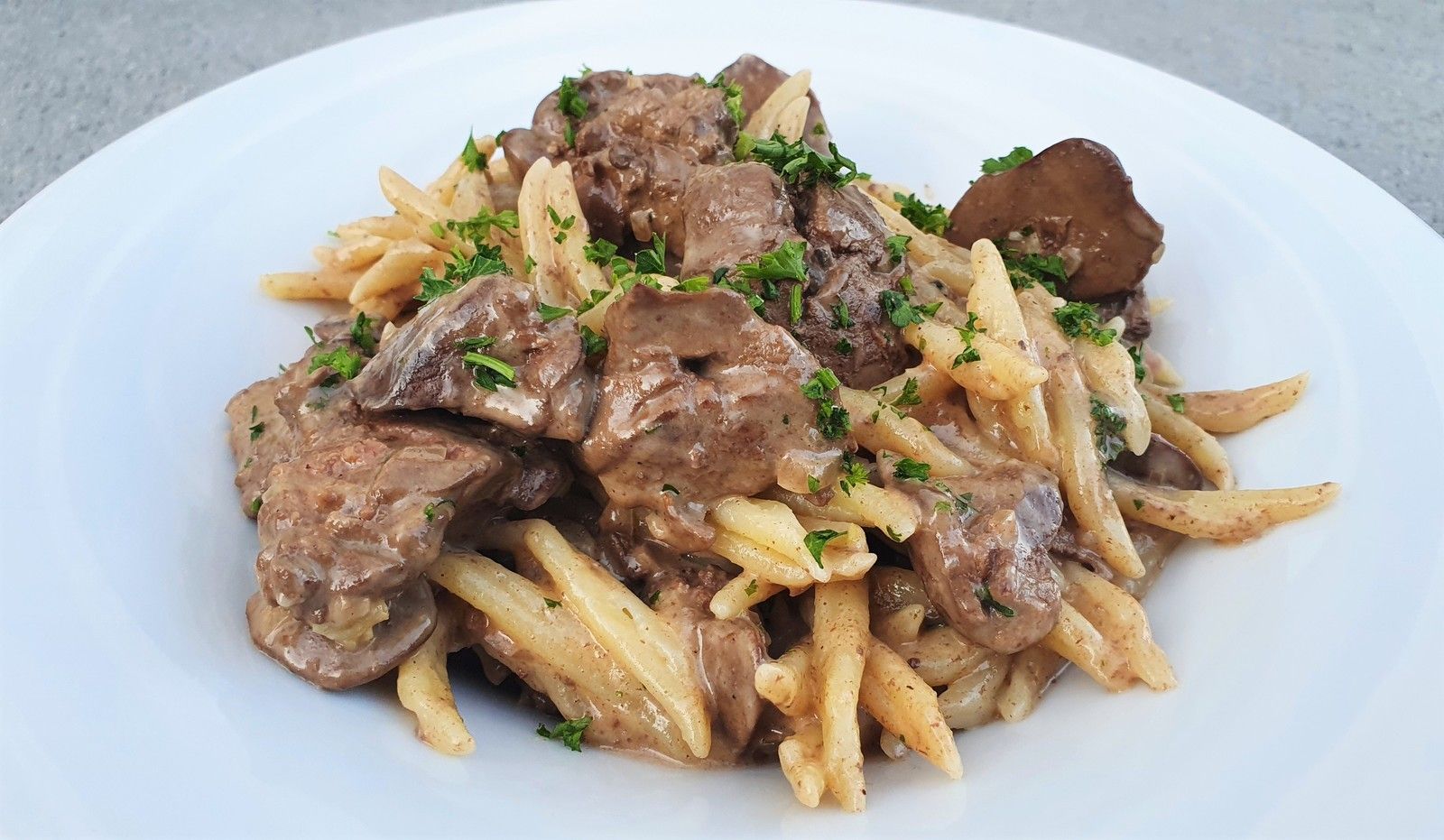 Pâtes au foie de volaille, sauce crème et vinaigre balsamiquePâtes au foie de volaille, sauce crème et vinaigre balsamique