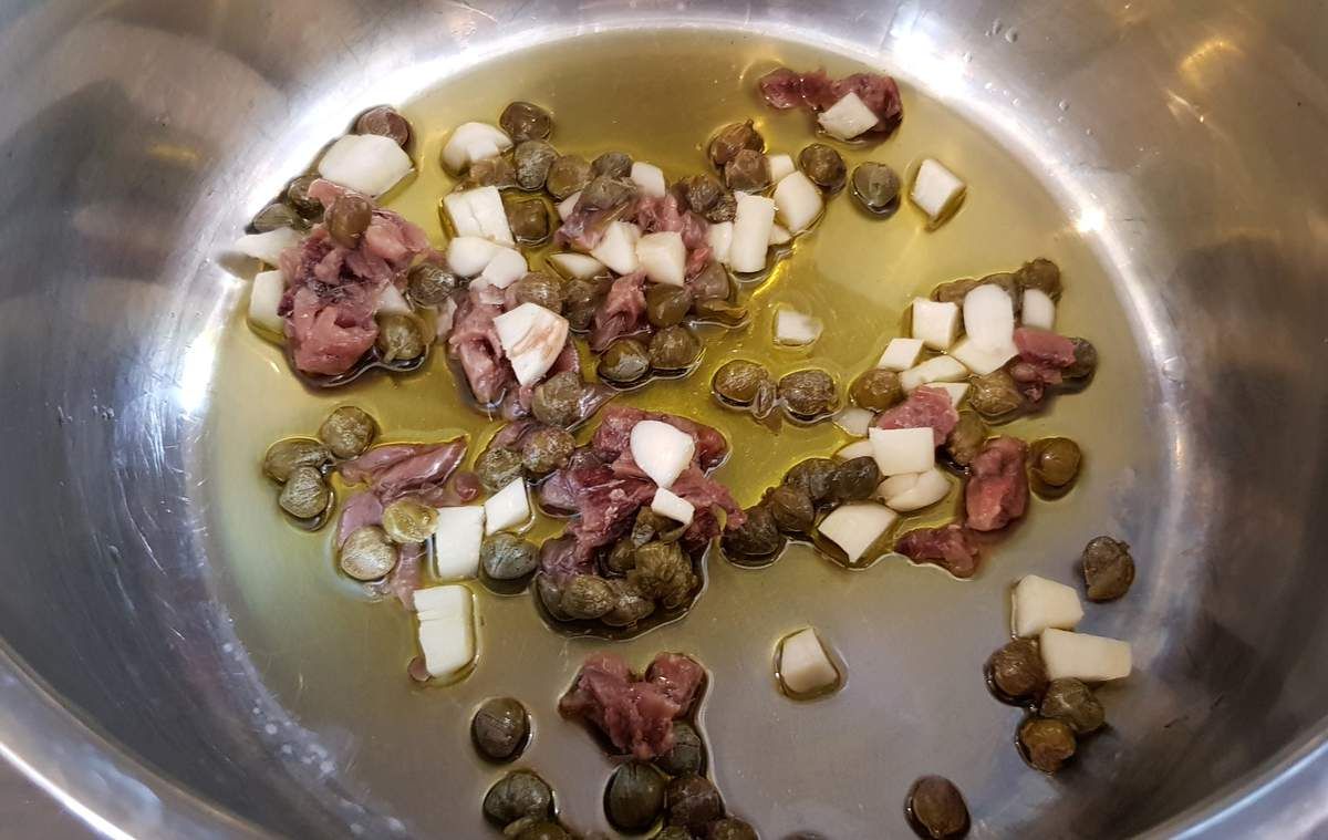 4) Dans une poêle, mettre à chauffer un bon filet d'huile d'olive. Baisser le feu sur feu doux et ajouter anchois, câpres et ail. Cuire ainsi 2 minutes en mélangeant. Ajouter les carapaces des crevettes et faire revenir 3 minutes en montant le feu sur feu moyen. Parallèlement, faire bouillir 5 dl d'eau avec le fumet de poisson dans une petite casserole.