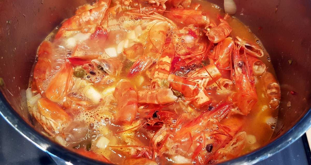1) Décortiquer les crevettes. Passer les corps sous l'eau froide et retirer l'intestin si besoin. Les mettre dans un bol. Rincer également les carapaces sous l'eau froide et les mettre dans un autre récipient.