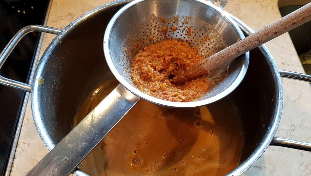 6) Mixer le contenu avec un plongeur puis passer le tout au chinois en appuyant bien avec une spatule pour extraire tout le jus. Remettre cette sauce bien lisse dans une poêle haute.
