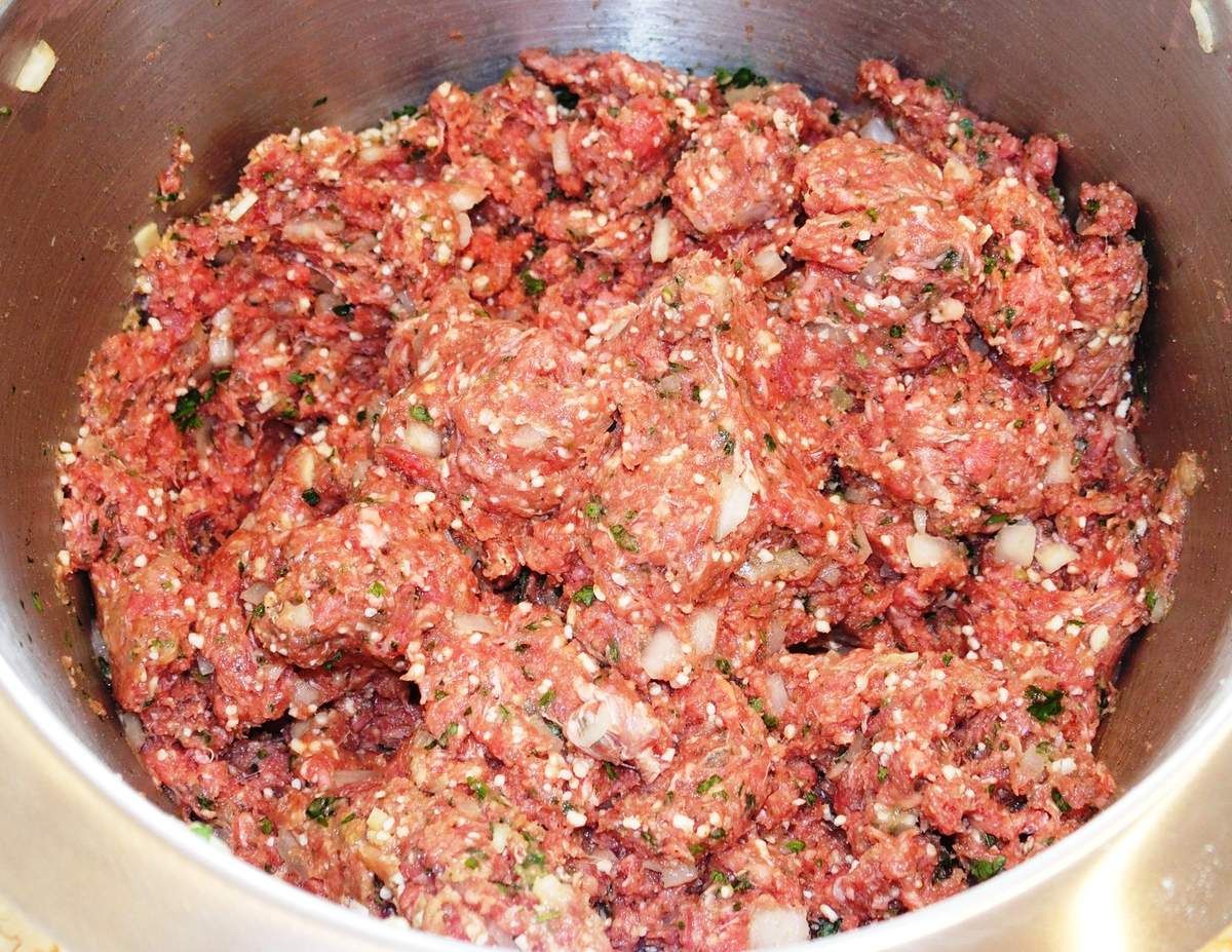2) Dans un grand récipient, mettre la viande hachée avec les oeufs, la farine et la chapelure. Mélanger de tout coeur avec vos deux mains. Ajouter l'oignon, le persil et l'ail. Mélanger.