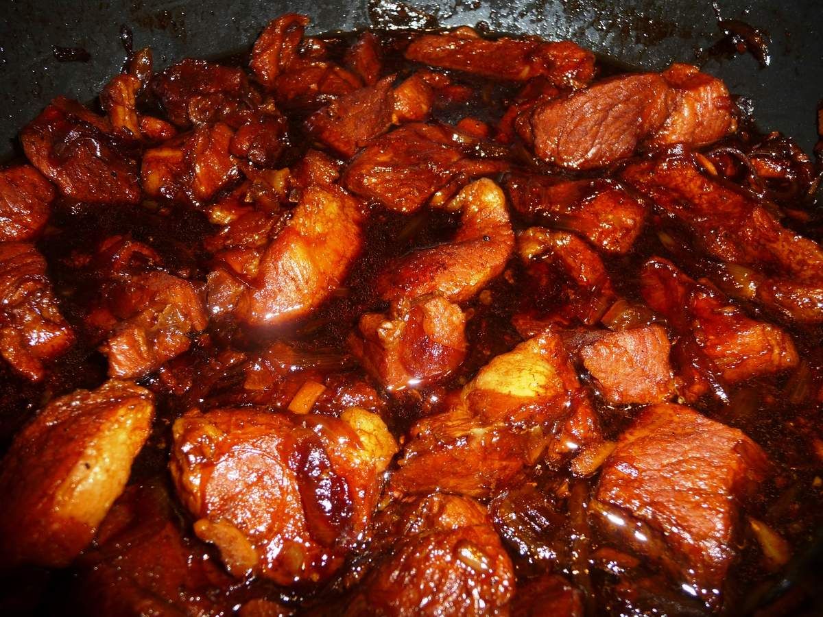 1) Couper le morceau de porc en morceaux (comme un ragoût). Plonger la viande dans une casserole d'eau bouillante durant 40 minutes