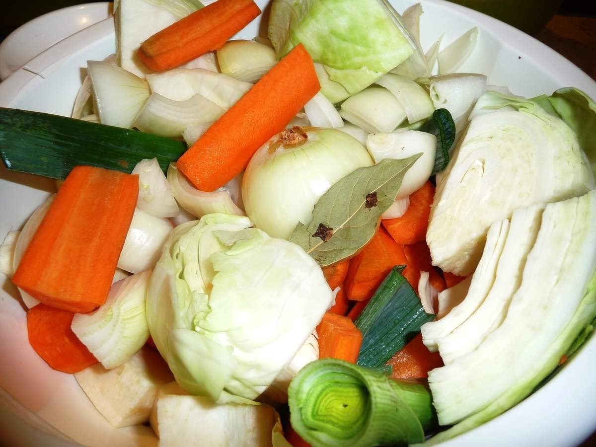 3) Pendant ce temps, préparer les légumes: Peler les carottes et les couper en tronçons de 3-4 cm. Laver les poireaux soigneusement, ne garder qu'une petite partie des feuilles vertes et couper le tout en tronçons d'environ 3-4 cm. Peler le céleri et le chou-rave et les couper en gros morceaux. Couper le chou en gros morceaux. Couper le deuxième oignon en gros morceaux. Peler les gousses d'ail et les couper grossièrement. Peler les pommes de terre et les couper en deux dans la longueur, les mettre à part des autres légumes, car nous les ajouterons ultérieurement.