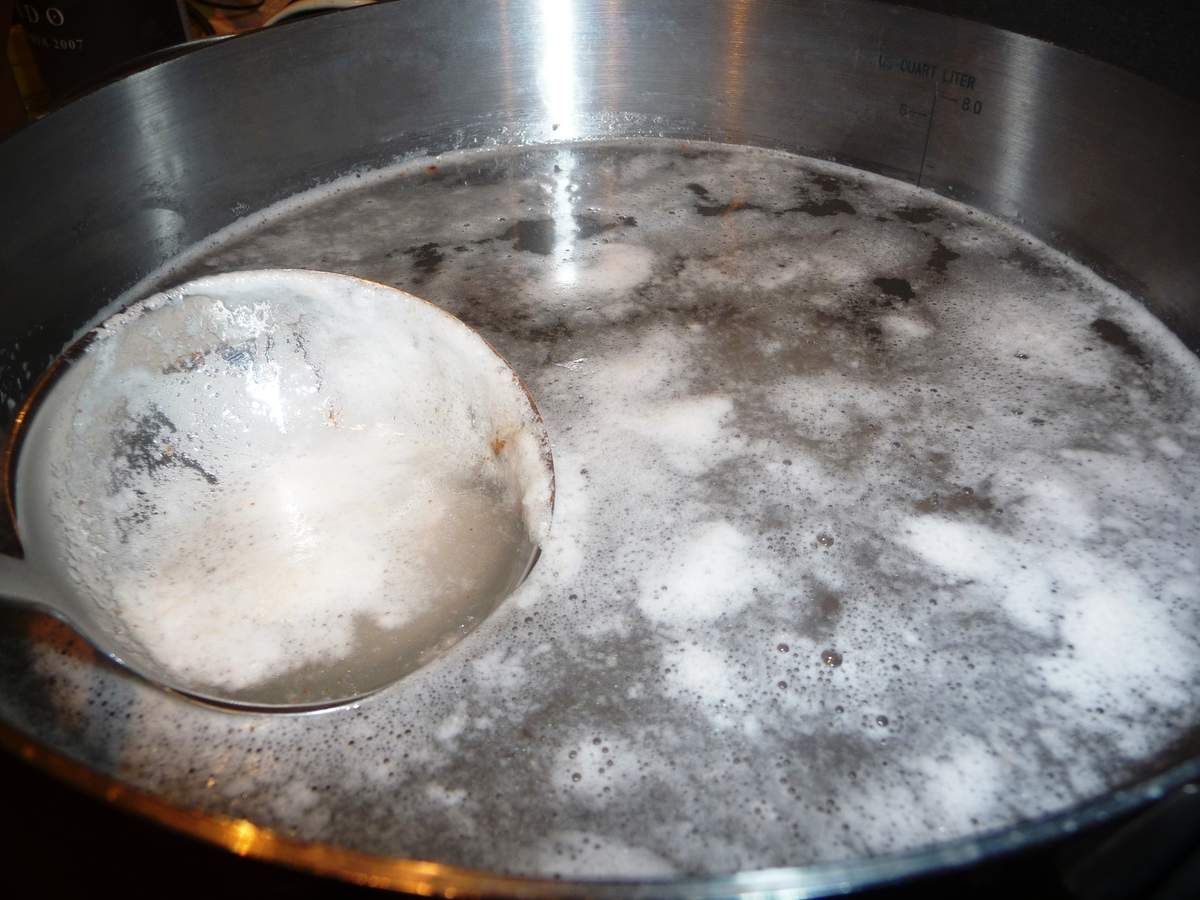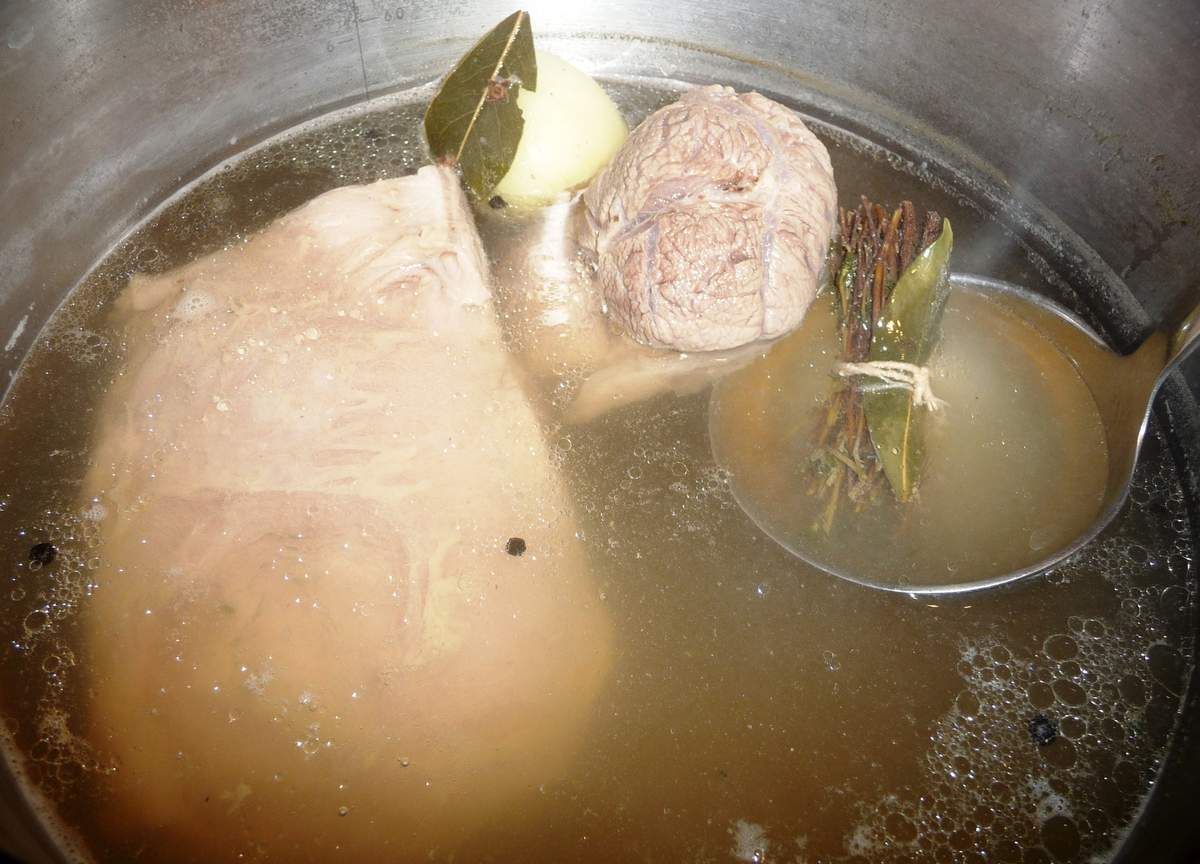 1) Mettre de l'eau froide dans une grande casserole. Y plonger le bouilli, ajouter 2 càs de sel et porter à ébullition. A l'ébullition, baisser le feu et maintenir une ébullition douce. A l'aide d'une louche ou d'une petite passoire, écumer (retirer la mousse blanche) au fur et à mesure. L'écume blanche contient les impuretés de la viande. Le sel ainsi que l'eau bouillante permettent de les faire sortir.