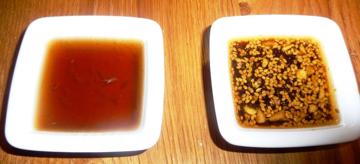 Sauce sésame: 5 càs de sauce soja, 3 càs d'huile de sésame, une gousse d'ail écrasée, 3 càs de mirin.