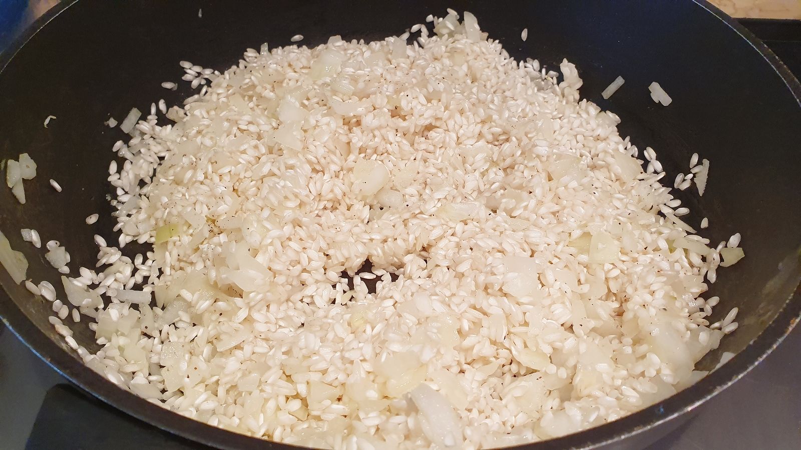 3) Dans une grande poêle à haut rebord, faire fondre 20 g de beurre. Ajouter l'oignon et le faire revenir 2 minutes. Ajouter le riz et mélanger jusqu'à ce qu'il soit translucide (2 minutes). Poivrer.