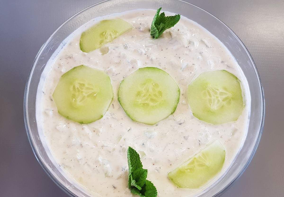 2) Dans un grand bol ou un plat creux, mettre les yaourts, le concombre, la gousse d'ail pelée et passée à travers un presse-ail, la menthe, le cumin. Ajouter un filet d'huile d'olive, saler et poivrer. Goûter et rectifier l'assaisonnement. Garder au frais.