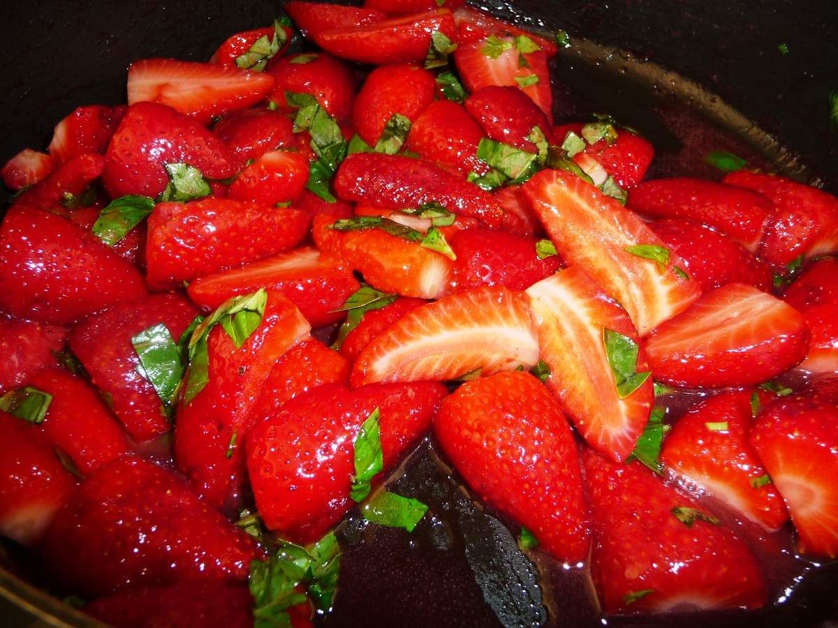 4) Pendant ce temps, laver les fraises et équeuter. Les couper en deux dans la longueur. Ciseler finement le basilic. Dans une poêle, faire fondre 20g de beurre. Sur feu moyen, ajouter les fraises et 2 à 3 càs de sucre (à votre goût et selon les fraises). Mélanger 3 minutes et ajouter le basilic. Laisser tiédir.