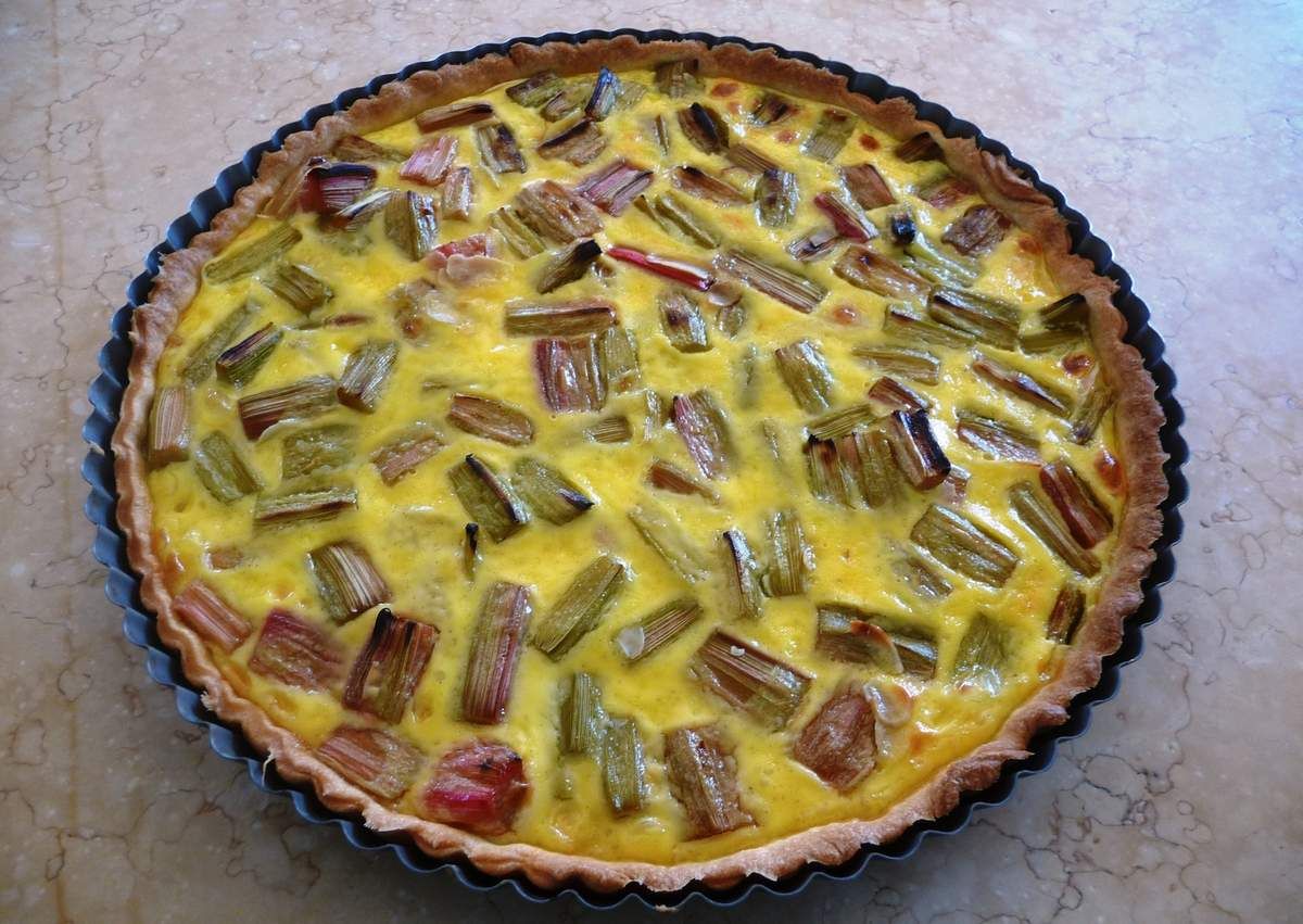2) Préchauffer le four à 200°C. Foncer un moule à tarte en le beurrant et farinant. Y déposer la pâte et piquer le fond avec une fourchette. Ajouter sur le fond les amandes effilées, puis les tronçons de rhubarbe. Enfourner pour 20 minutes au milieu du four.